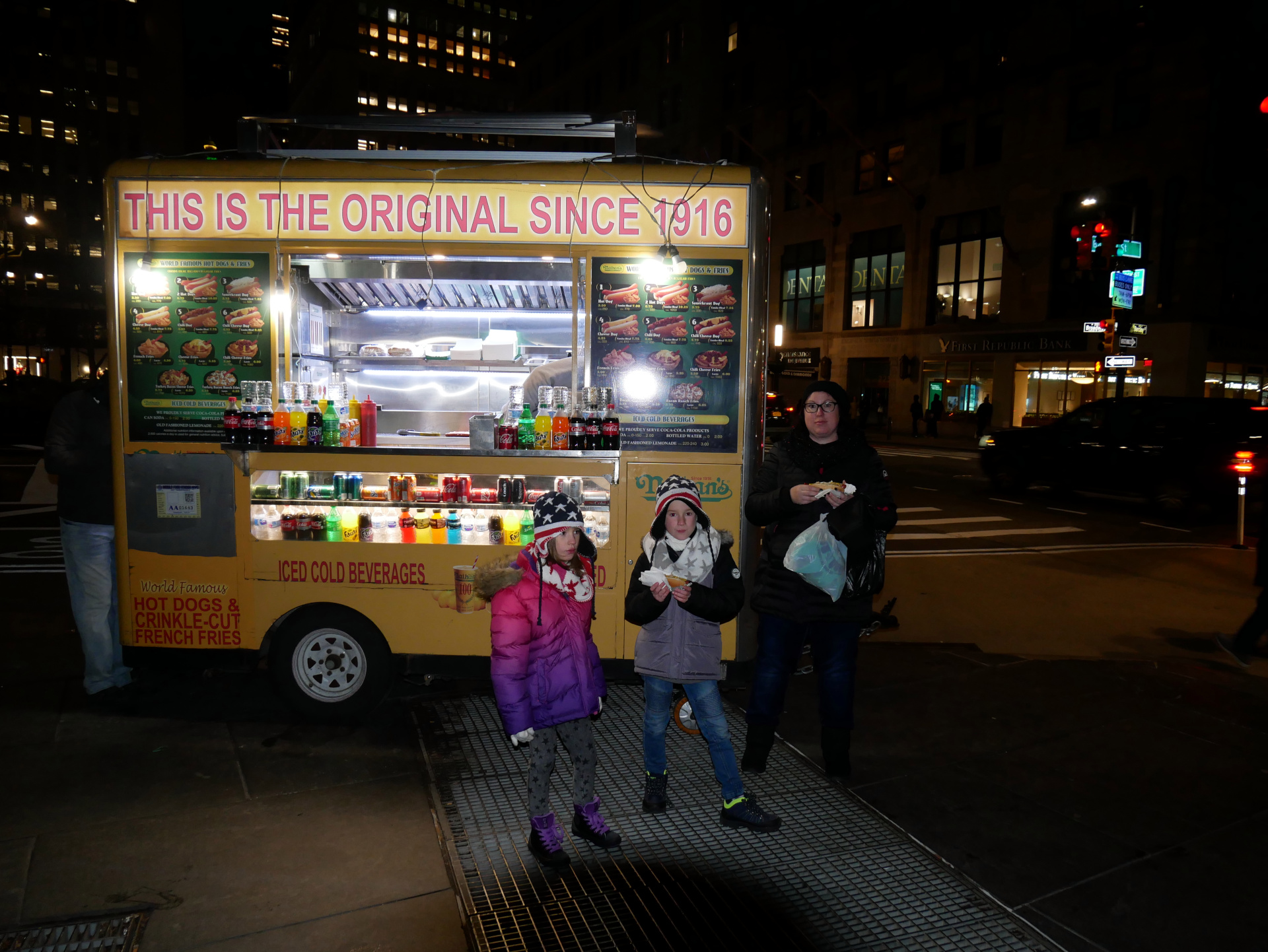 Weiter an der Küste zur Brooklyn Bridge. Von dort hat man einen fantastischen Blick auf Manhattan. Gerade im Dunkeln. Hier kann man auch günstig Souveniers kaufen. Wir wollen es allerdings nochmal in Chinatown versuchen. Weiter gings den Broadway abwärts bis zum Charging Bull. Zwischendurch ein Sauerkraut-Hot Dog in der Nähe der Wall Street und im Fulton Center honiggeröstete Erdnüsse genascht. Ab zurück mit der PATH zum Hotel. Absolut geniale Anbindung.